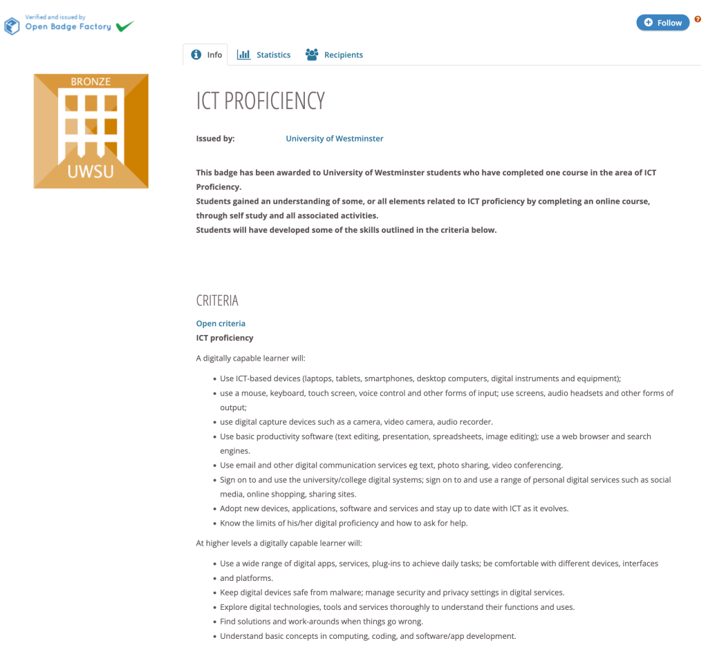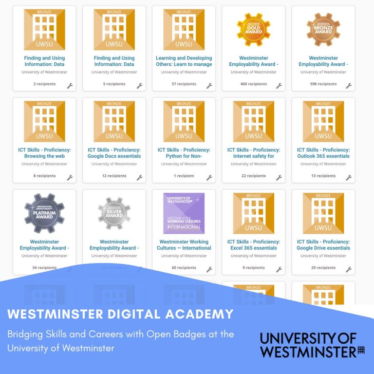 Stephanie Coelho: At Westminster, we’re using the badge system in multiple ways, whether that may be integrated within modules like the study skills and employability one or on a much wider scale their employability award. Within this award, by students obtaining their silver, platinum and gold awards, they’re showcasing the time they’ve taken in enhancing their career development and the extracurricular activities that they’ve completed during their time within the university. We also have the Westminster Digital Academy, which I’m a huge advocate for that focuses specifically on digital skills. We have multiple badges within this, ranging from communicating and participating in social platforms to finding and using information. Across the years, the visibility of these short courses have increased, and the badges obtained in the past year have almost tripled from the previous. So I’d say that the status of this particular project is running quite successfully and gaining a lot of interest from students.