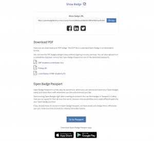 As you see in this screenshot, you will be able to share your badge straight away into social media services by clicking the icons on the upper section of the page or by copying and sharing the link of your badge. You can also, as we recommend, save your badge in Open Badge Passport, the free service, where badge earners can create micro-portfolios with their badges, add evidence on them and get them endorsed by members of their community.