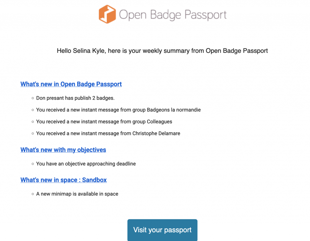 Jos sinulla ei ole viimeaikaista toimintaa Open Badge Passportissa, sähköpostiviestissä ehdotetaan: