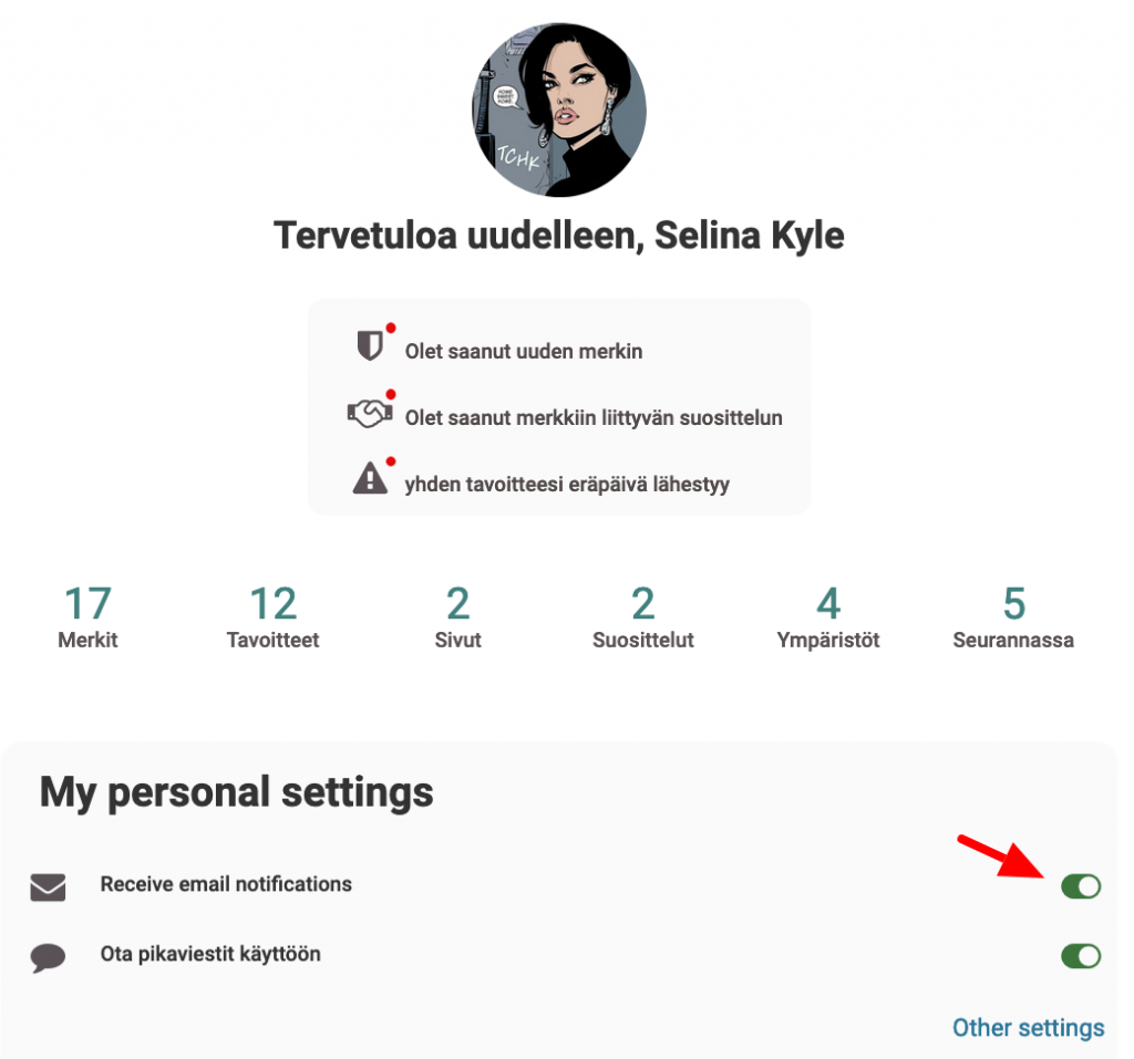 - Uutiset merkeistäsi: uudet odottavat merkit, saadut onnittelut ja suosittelut